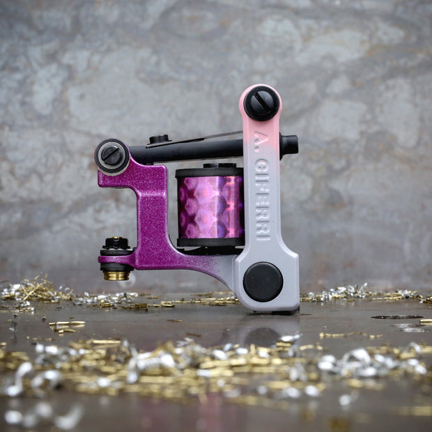 This machine comes stock as a strong, medium speed liner (or fast shader) at around 105-110 cps loaded (about 125-130 cps unloaded). Because of the large voltage range, it is capable of all size needle groupings. (*the contact screw can be backed out to run in the 90 cps range as well). For a slappier, punchier hit, the backer spring under the contact spring can be removed.